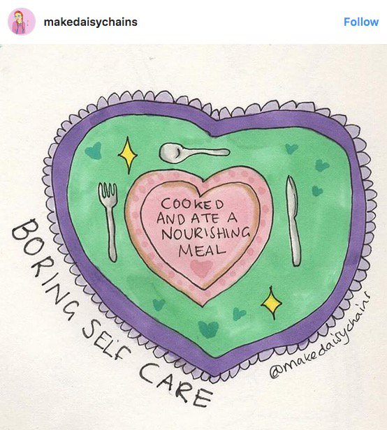 Maybe you’ve seen the #boringselfcare hashtag circulating; Hannah is the talented person behind the original art. Go follow her IG page (@makedaisychains), because she has beautiful and powerful sketches about mental health. Self-care is so very important, especially in the world in which we currently live. Take a nap. Take a shower. Get a good crying session in. Take care of yourself.